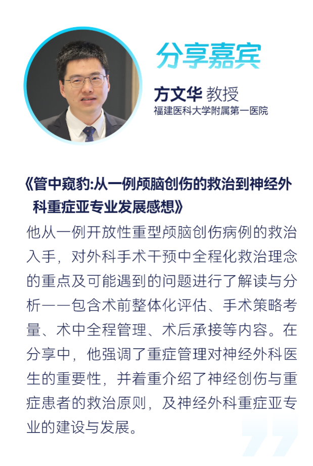 會議上半場學(xué)術(shù)論壇,與會專家聚焦在各類顱腦創(chuàng)傷的規(guī)范化管理和相關(guān)經(jīng)驗的分享。復(fù)旦大學(xué)附屬華山醫(yī)院胡錦教授、首都醫(yī)科大學(xué)宣武醫(yī)院江榮才教授擔任會議主持,上海交通大學(xué)醫(yī)學(xué)院附屬仁濟醫(yī)院江基堯教授、馮軍峰教授,南方醫(yī)科大學(xué)南方醫(yī)院邱炳輝教授,空軍軍醫(yī)大學(xué)唐都醫(yī)院葛順楠教授,福建醫(yī)科大學(xué)附屬第一醫(yī)院方文華教授擔任分享嘉賓。